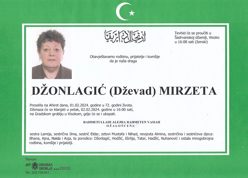 DŽONLAGIĆ (Dževad) MIRZETA 02.02.2024. godine u 16:00 sati