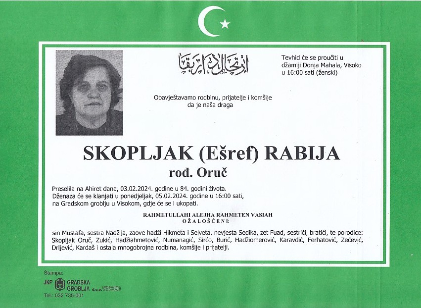 SKOPLJAK (Ešref) RABIJA 05.02.2024. godine u 16:00 sati
