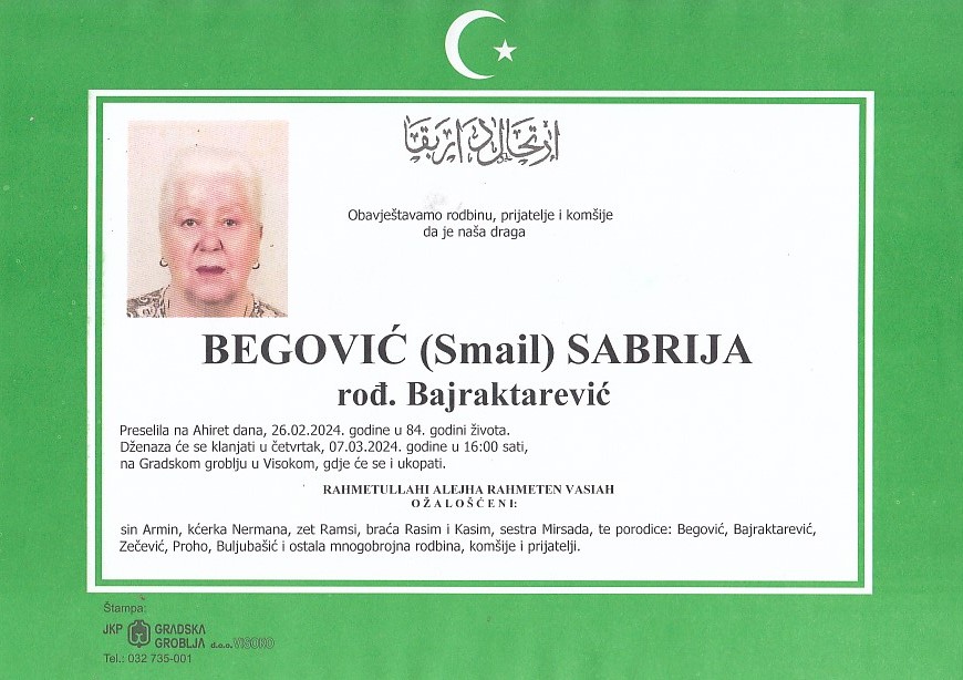 BEGOVIĆ (Smail) SABRIJA 07.03.2024. godine u 16:00 sati