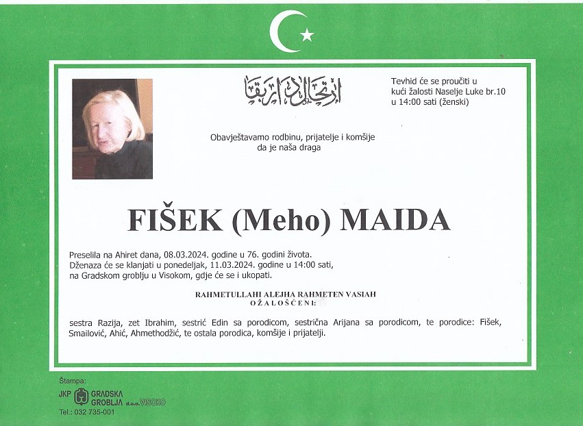 FIŠEK (Meho) MAIDA 11.03.2024. godine u 14:00 sati