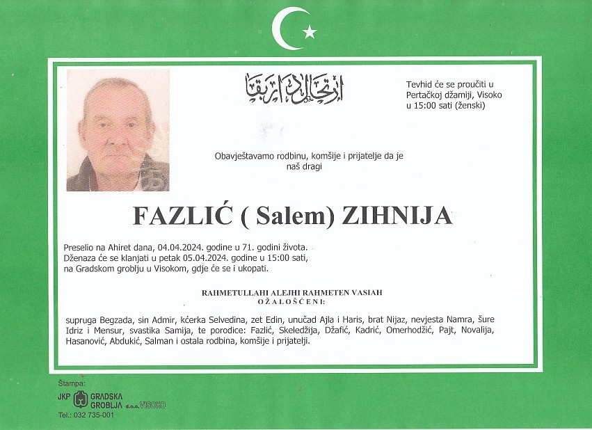 FAZLIĆ (Salem) ZIHNIJA 05.04.2024. godine u 15:00 sati