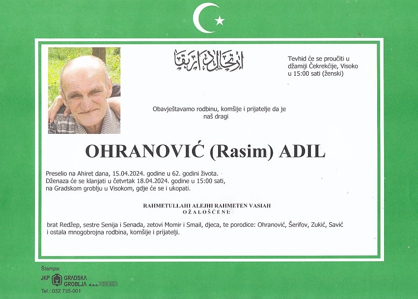OHRANOVIĆ (Rasim) ADIL 18.04.2024. godine u 15:00 sati