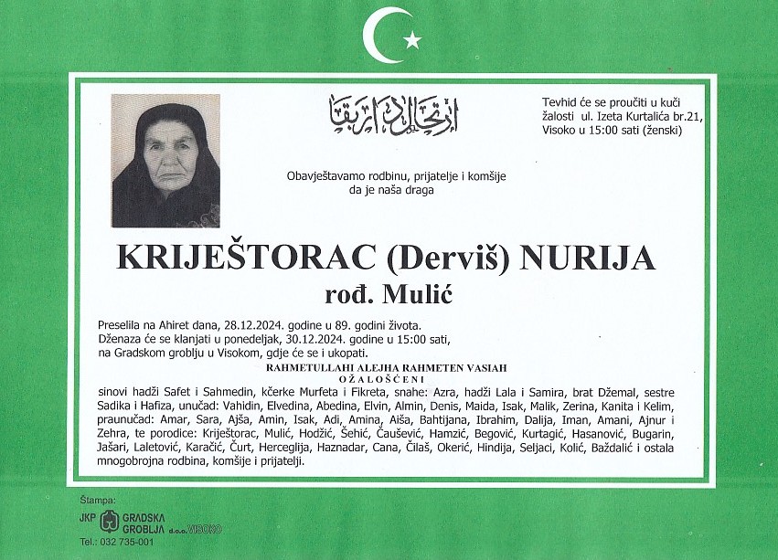 KRIJEŠTORAC (Derviš) NURIJA 30.12.2024. godine u 15:00 sati