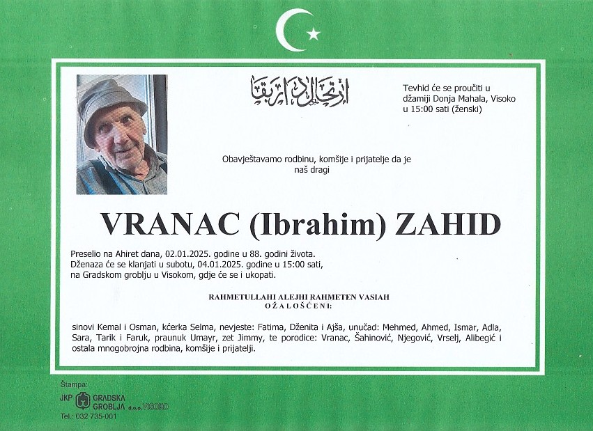 VRANAC (Ibrahim) ZAHID 04.01.2025. godine u 15:00 sati