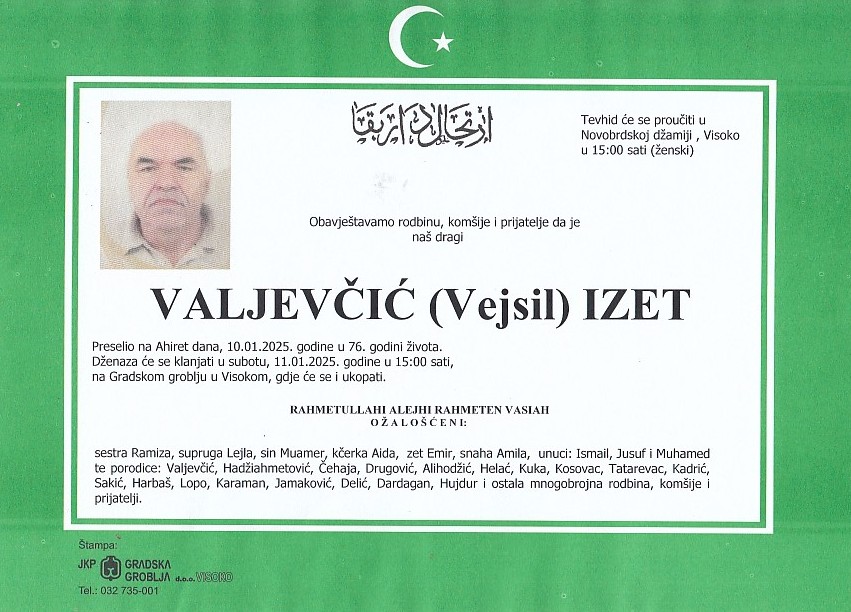 VALJEVČIĆ (Vejsil) IZET 11.01.2025. godine u 15:00 sati