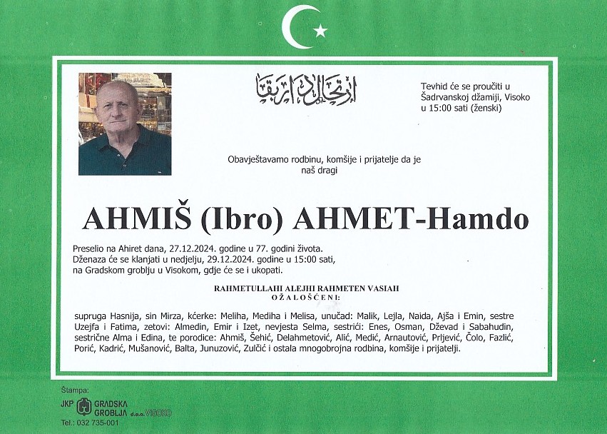 AHMIŠ (Ibro) AHMET 29.12.2024. godine u 15:00 sati