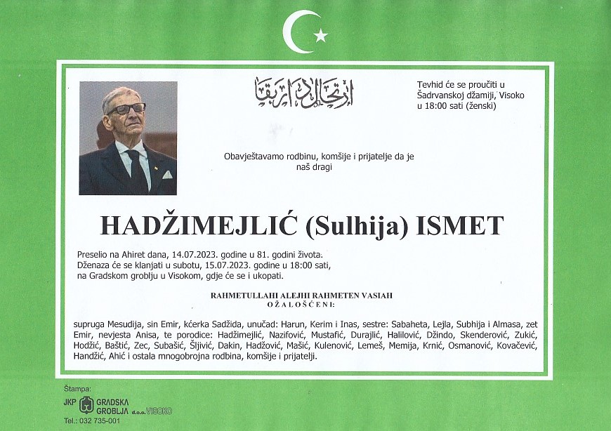 HADŽIMEJLIĆ (Sulhija) ISMET 15.07.2023. godine u 18:00 sati