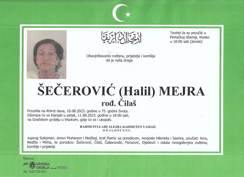 ŠEČEROVIĆ (Halil) MEJRA 11.08.2023. godine u 18:00 sati