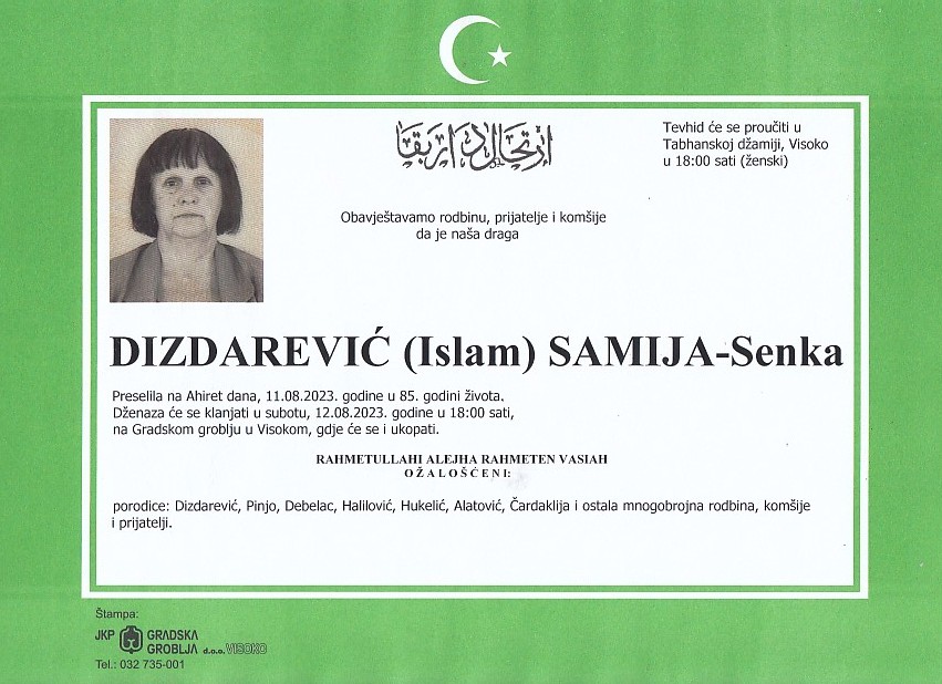 DIZDAREVIĆ (Islam) SAMIJA 12.08.2023. godine u 18:00 sati