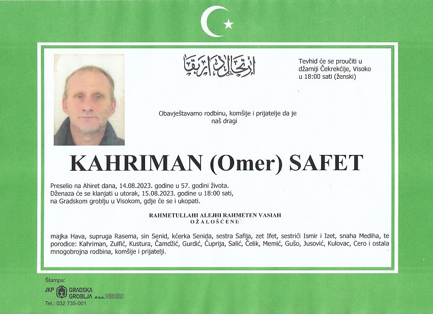 KAHRIMAN (Omer) SAFET 15.08.2023. godine u 18:00 sati