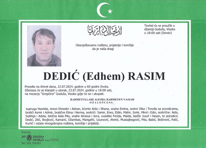 DEDIĆ (Edhem) RASIM 23.07.2024. godine u 18:00 sati