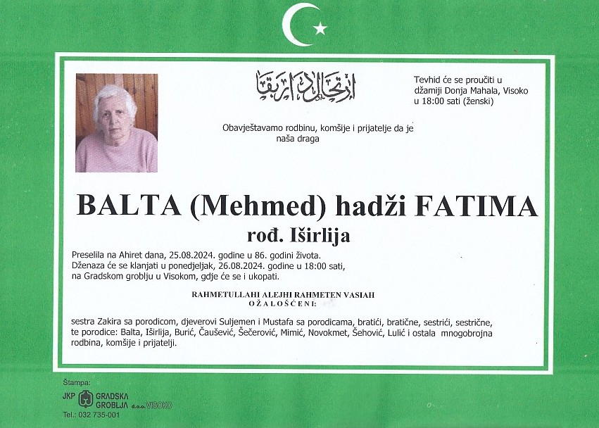 BALTA (Mehmed) FATIMA 26.08.2024. godine u 18:00 sati