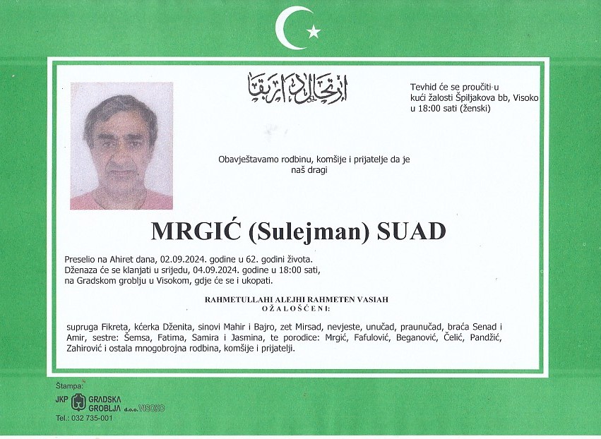 MRGIĆ (Sulejman) SUAD 04.09.2024. godine u 18:00 sati