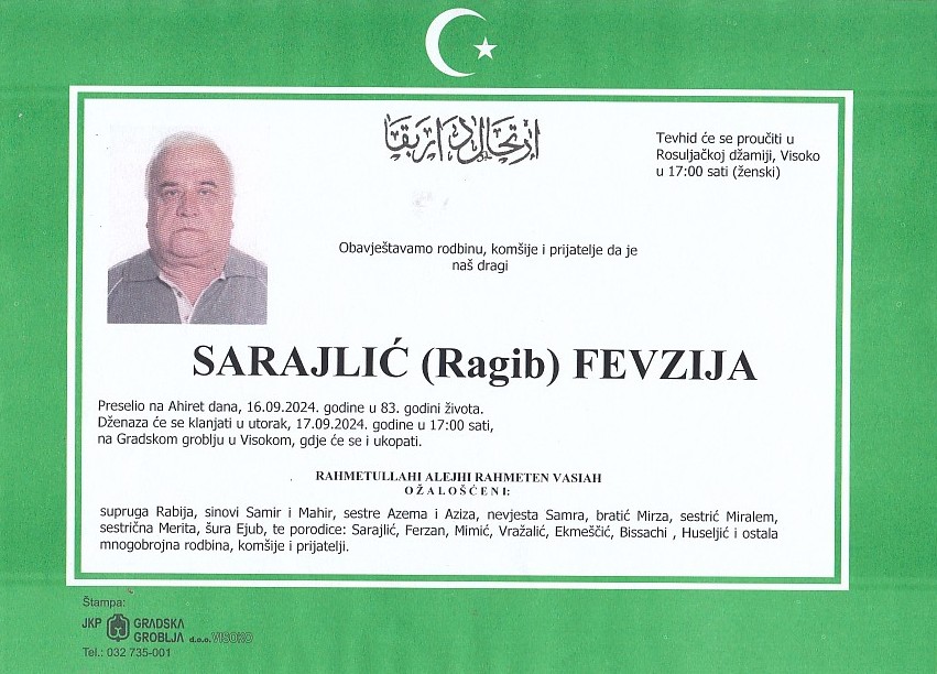 SARAJLIĆ (Ragib) FEVZIJA 17.09.2024. godine u 17:00 sati