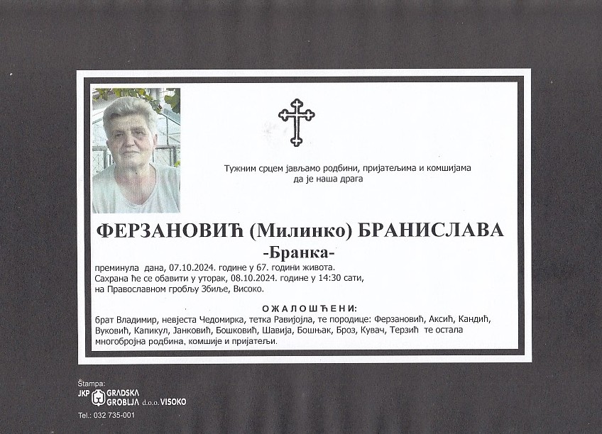 FERZANOVIĆ (Milinko) BRANISLAVA 08.10.2024. godine u 14:30 sati