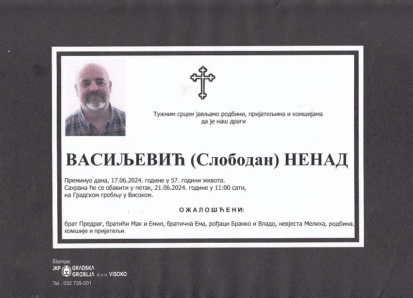 VASILJEVIĆ (Slobodan) NENAD 21.06.2024. godine u 11:00 sati