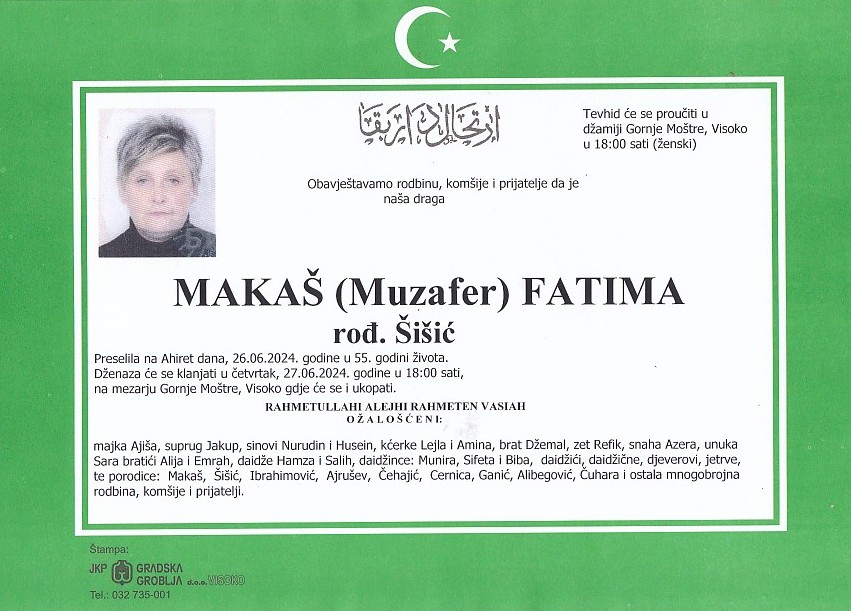MAKAŠ (Muzafer) FATIMA 27.06.2024. godine u 18:00 sati