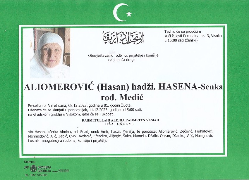 ALIOMEROVIĆ (Hasan) HASENA 11.12.2023. godine u 15:00 sati