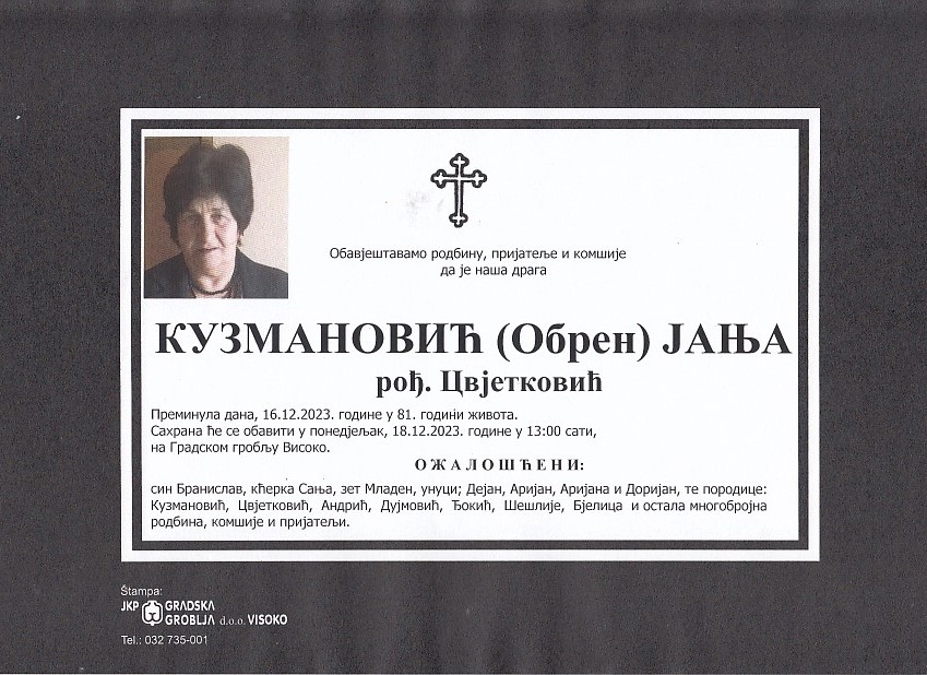 KUZMANOVIĆ (Obren) JANJA 18.12.2023. godine u 13:00 sati