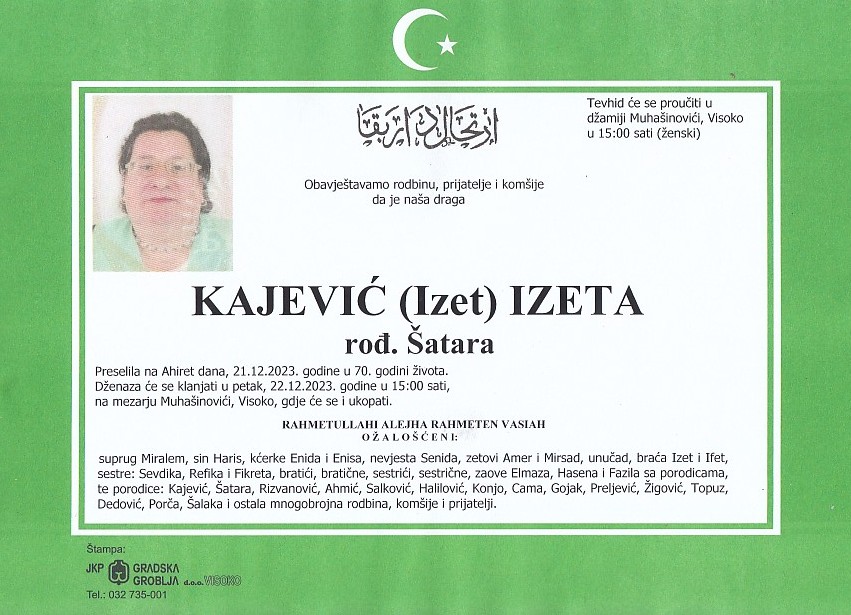 KAJEVIĆ (Izet) IZETA 22.12.2023. godine u 15:00 sati