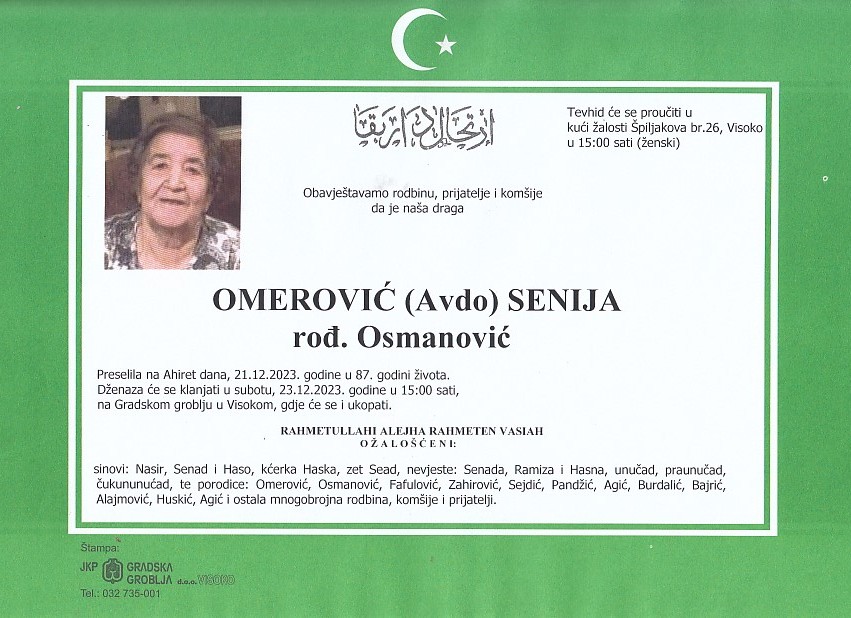 OMEROVIĆ (Avdo) SENIJA 23.12.2023. godine u 15:00 sati