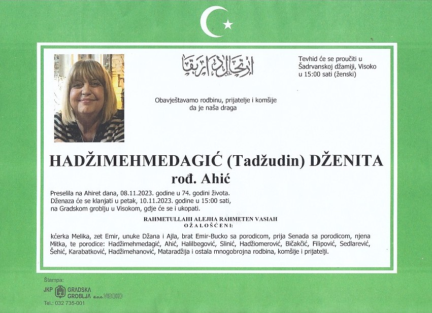 HADŽIMEHMEDAGIĆ (Tadžudin) DŽENITA 10.11.2023. godine u 15:00 sati