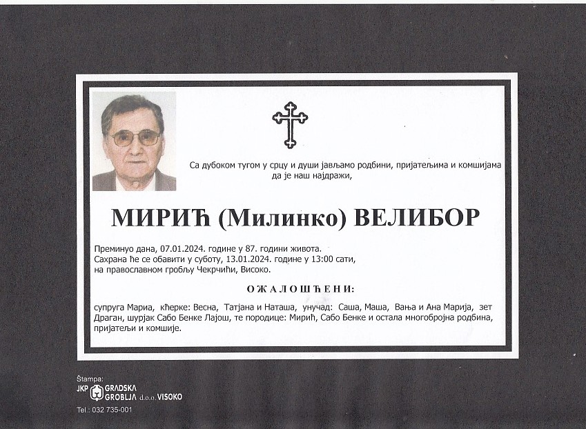 MIRIĆ (Milinko) VELIBOR 13.01.2024. godine u 13:00 sati