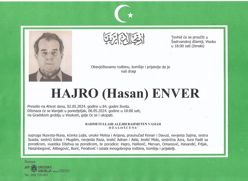 HAJRO (Hasan) ENVER 06.05.2024. godine u 18:00 sati