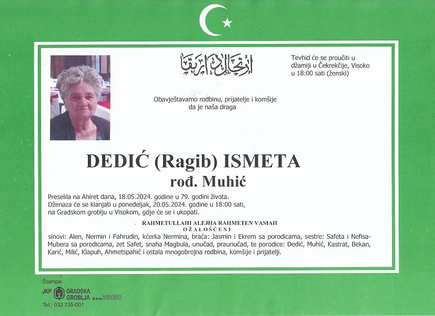 DEDIĆ (Ragib) ISMETA 20.05.2024. godine u 18:00 sati