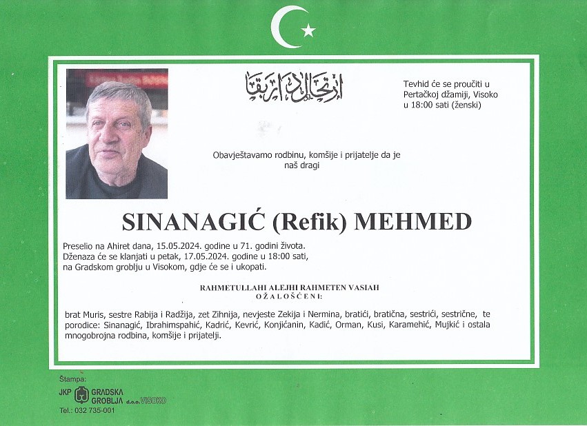 SINANAGIĆ (Refik) MEHMED 17.05.2024. godine u 18:00 sati