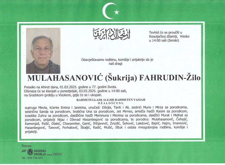 MULAHASANOVIĆ (Šukrija) FAHRUDIN 03.03.2025. godine u 14:00 sati
