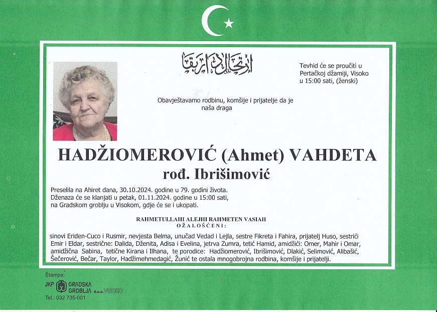 HADŽIOMEROVIĆ (Ahmet) VAHDETA 01.11.2024. godine u 15:00 sati