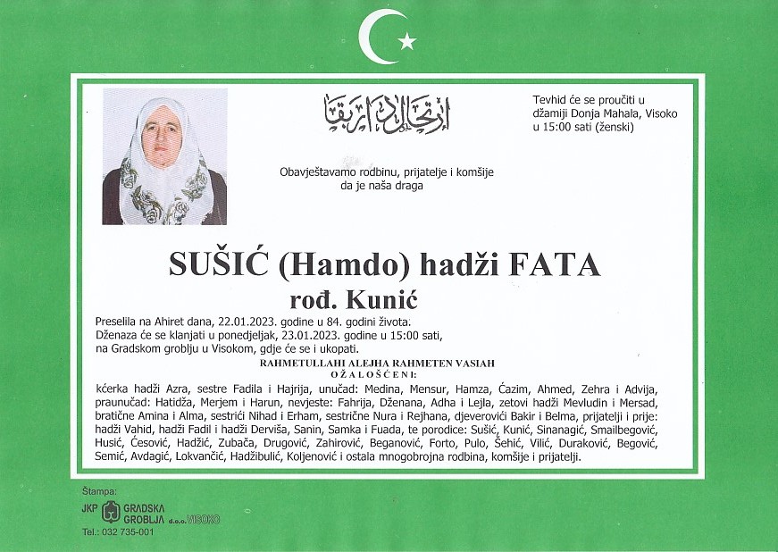 SUŠIĆ (Hamdo) FATA 23.01.2023. godine u 15:00 sati