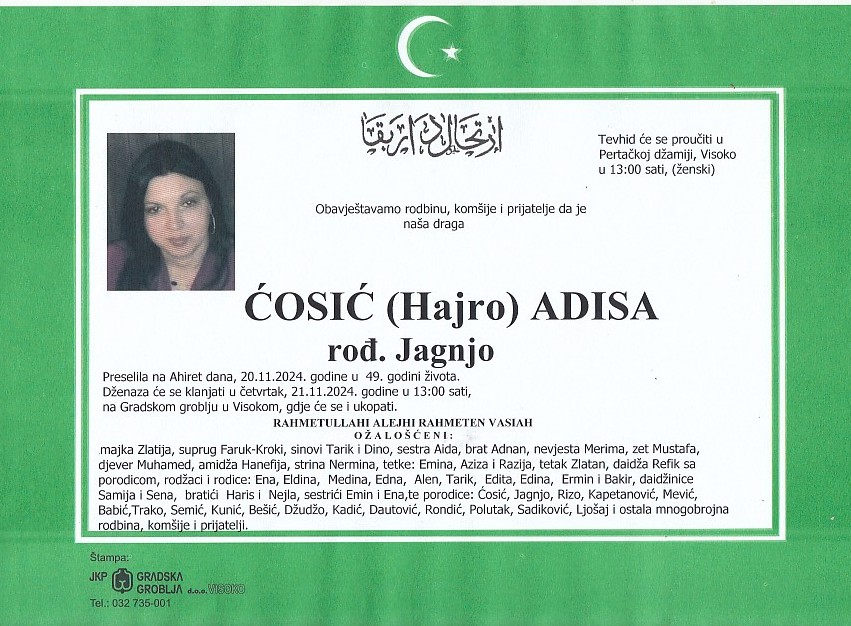 ĆOSIĆ (Hajro) ADISA 21.11.2024. godine u 13:00 sati