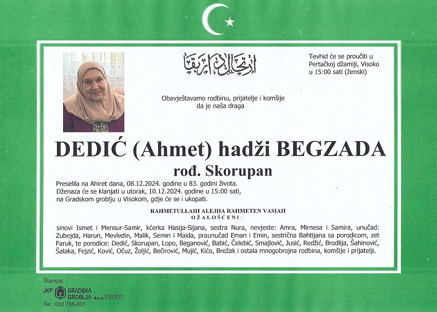 DEDIĆ (Ahmet) BEGZADA 10.12.2024. godine u 15:00 sati