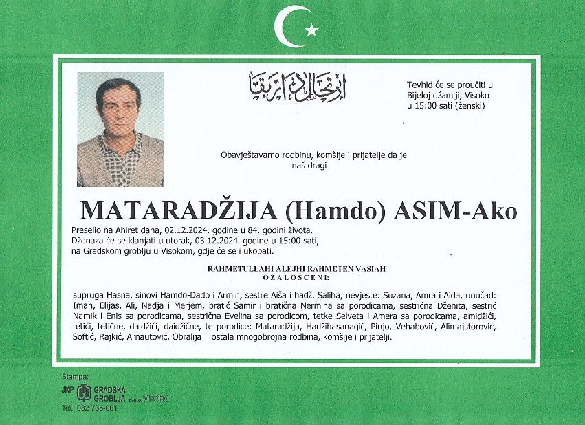 MATARADŽIJA (Hamdo) ASIM 03.12.2024. godine u 15:00 sati