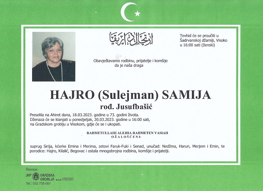 HAJRO (Sulejman) SAMIJA 20.03.2023. godine u 16:00 sati