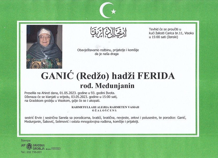 GANIĆ (Redžo) hadži FERIDA 03.05.2023. godine u 15:00 sati