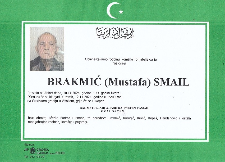 BRAKMIĆ (Mustafa) SMAIL 12.11.2024. godine u 15:00 sati