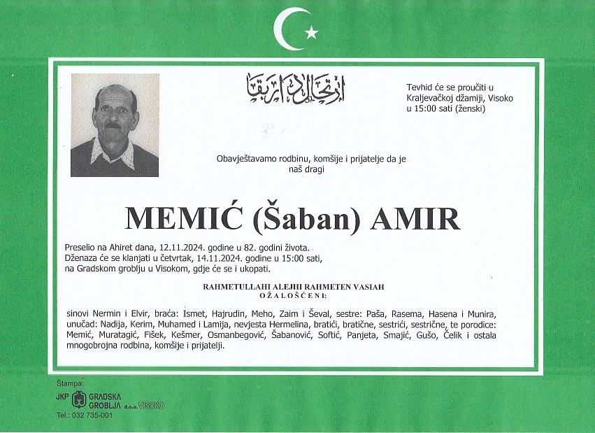 MEMIĆ (Šaban) AMIR 14.11.2024. godine u 15:00 sati