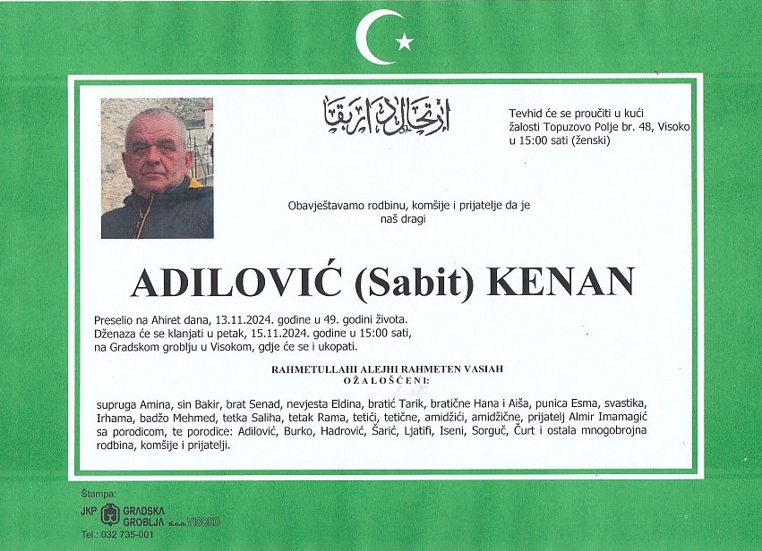 ADILOVIĆ (Sabit) KENAN 15.11.2024. godine u 15:00 sati