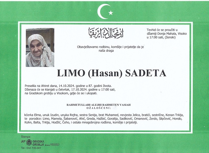 LIMO (Hasan) SADETA 17.10.2024. godine u 17:00 sati