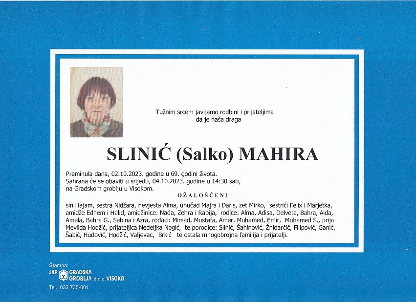 SLINIĆ (Salko) MAHIRA 04.10.2023. godine u 14:30 sati