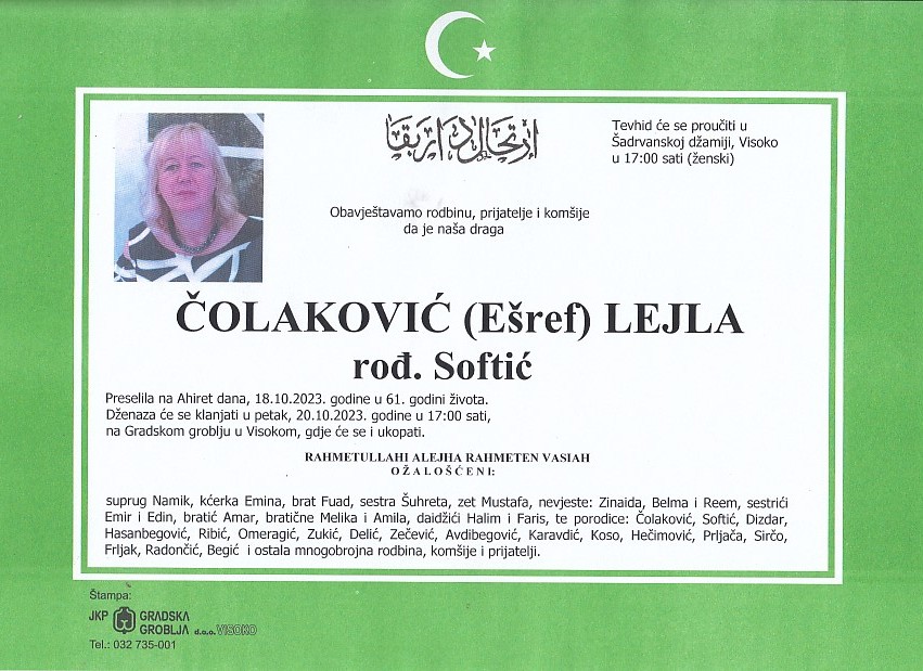 ČOLAKOVIĆ (Ešref) LEJLA 20.10.2023. godine u 17:00 sati