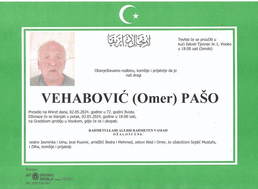 VEHABOVIĆ (Omer) PAŠO 03.05.2024. godine u 18:00 sati