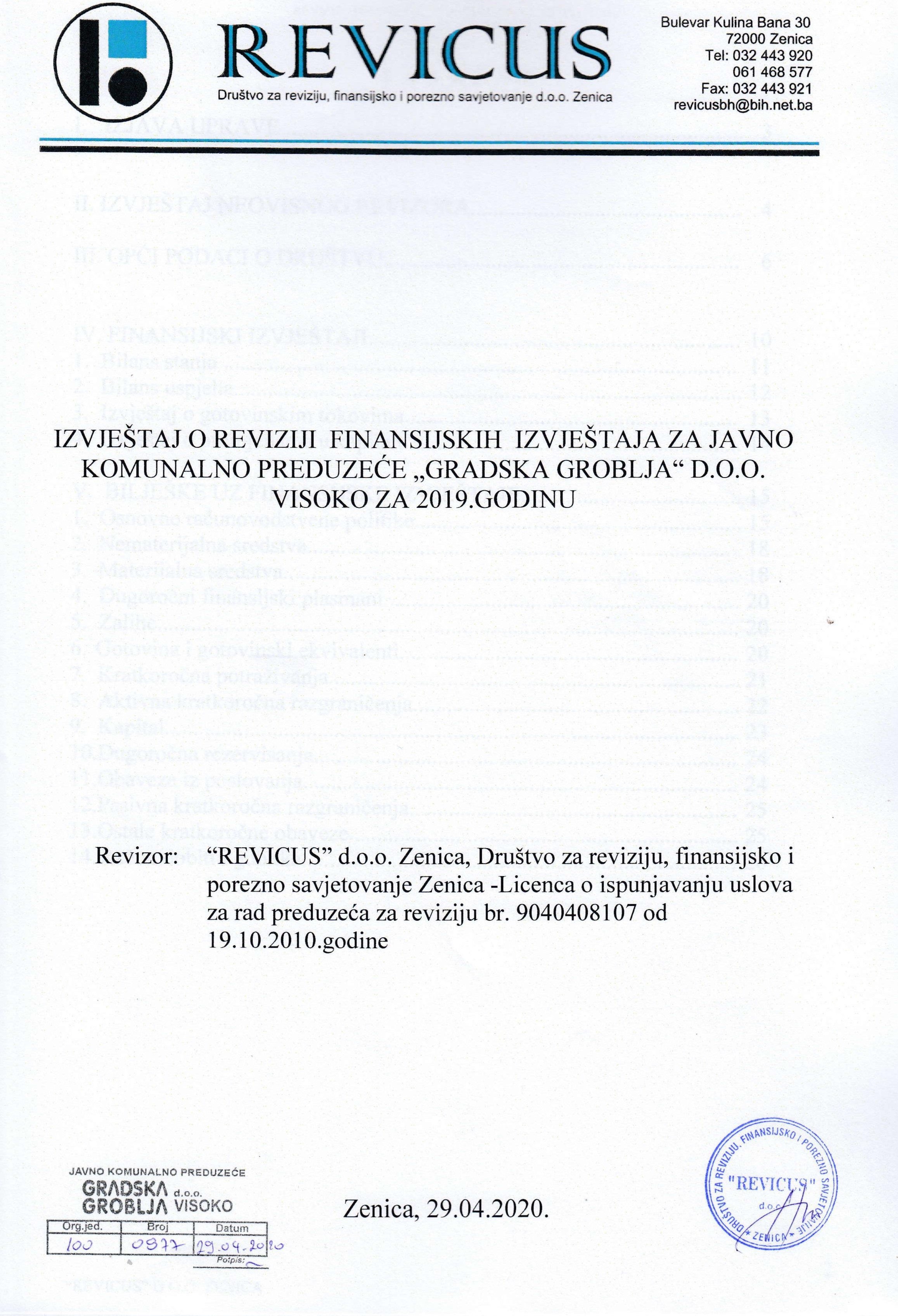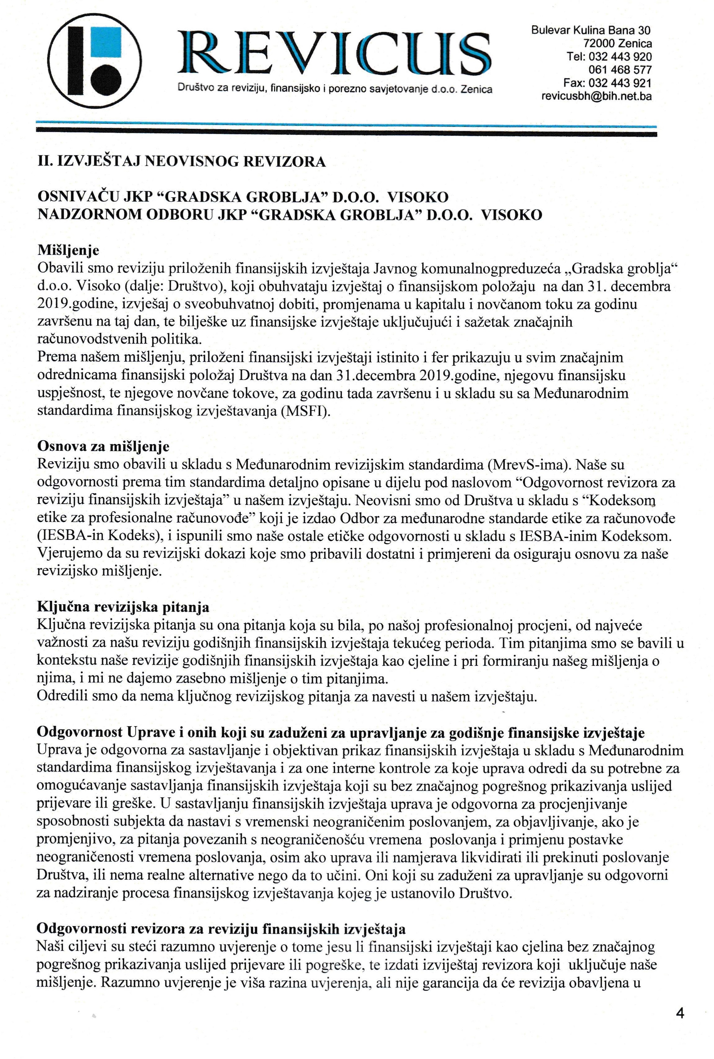IZVJEŠTAJ O REVIZIJI FINANSIJSKIH IZVJEŠTAJA ZA JKP "GRADSKA GROBLJA" DOO VISOKO ZA 2019.godinu