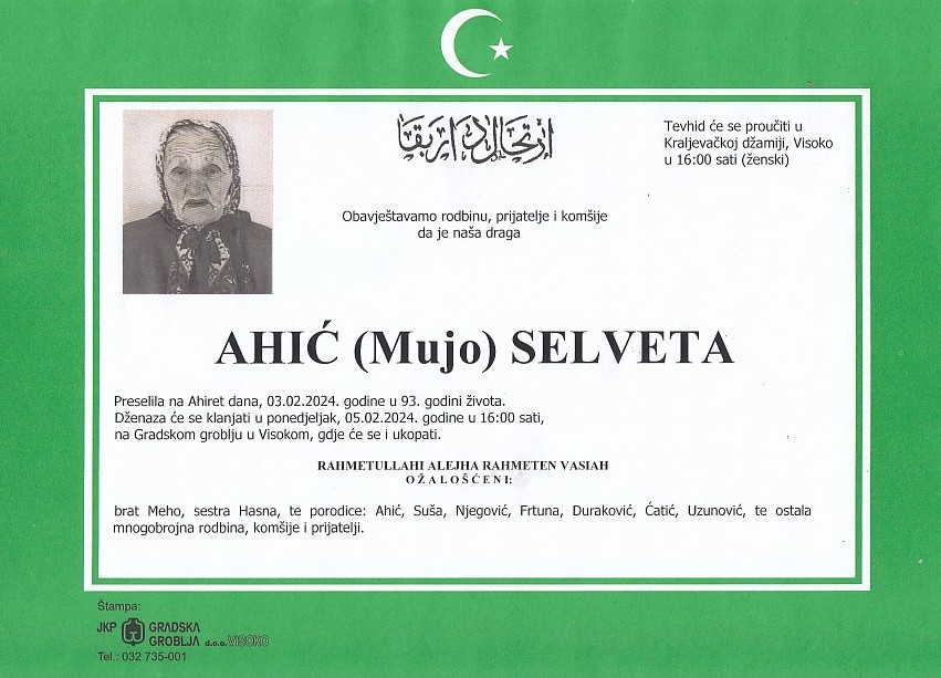 AHIĆ (Mujo) SELVETA 05.02.2024. godine u 16:00 sati