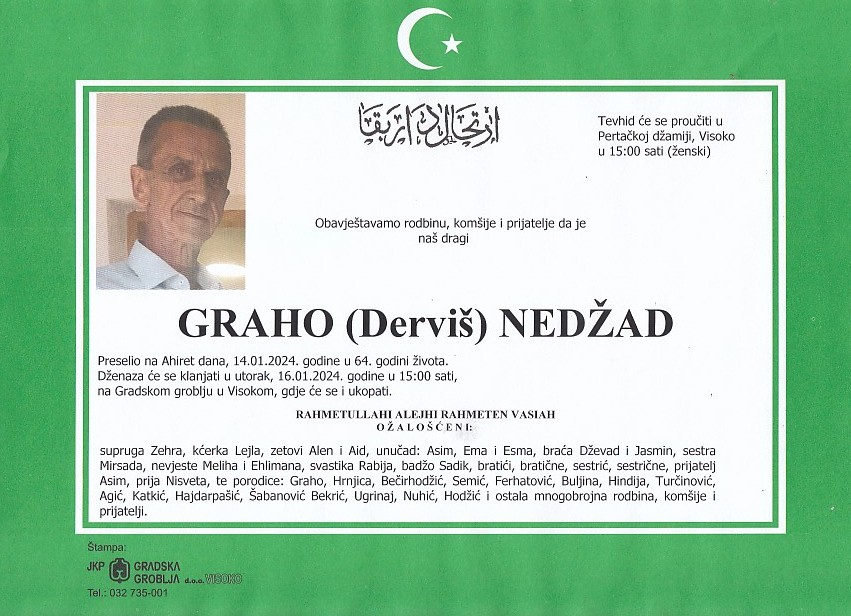 GRAHO (Derviš) NEDŽAD 16.01.2024. godine u 15:00 sati