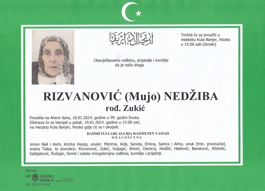 RIZVANOVIĆ (Mujo) NEDŽIBA 19.01.2024. godine u 15:00 sati