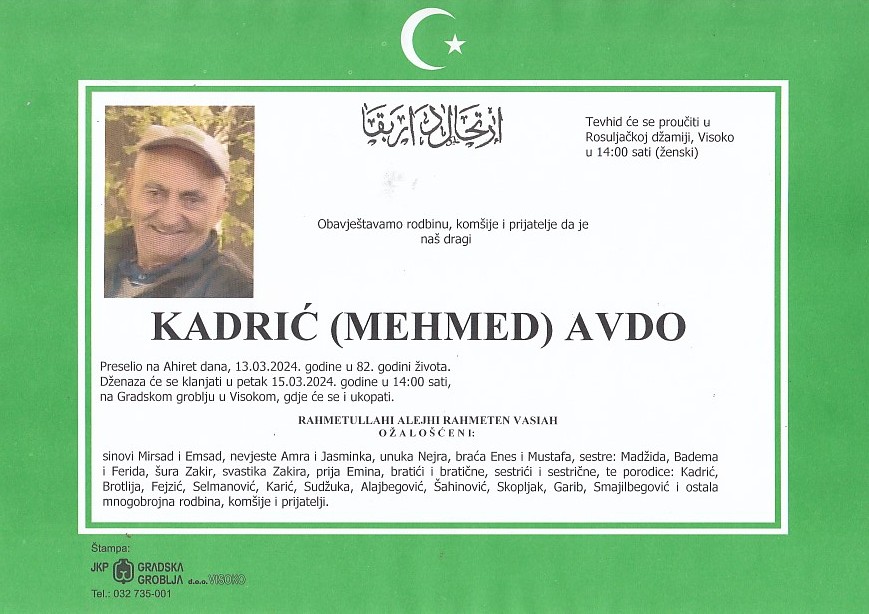 KADRIĆ (Mehmed) AVDO 15.03.2024. godine u 14:00 sati